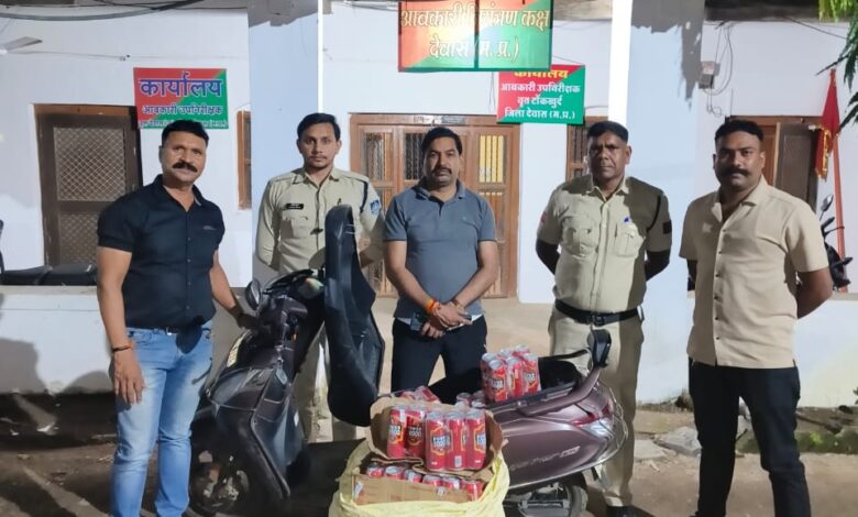 09.2024* को वृत्त देवास ब में रात्रि गस्त के दौरान एक जूपिटर स्कूटर जिसका नंबर एम पी 41 जेड ई 1619 जिसे एक व्यक्ति चला रहा था जो संदिग्ध प्रतीत हो रहा था तो उसे रोककर समक्ष गवाह विधिवत तलाशी ली गई जिसमें गाड़ी की डिक्की एवं आगे रखे थैले से कुल 120 केन विदेशी मदिरा माल्ट बीयर जिसकी मात्रा 60 बल्क लीटर बरामद हुई जो चालक द्वारा अवैध रूप से संग्रह कर बिना पास परमिट के परिवहन की जा रही थी , जो मध्य प्रदेश आबकारी अधिनियम 1915 की धारा 34(1) क एवं 34(2) का उलंघन होने से प्रकरण पंजीबद्ध कर विवेचना में लिया गया,जप्त सामग्री एवं वाहन का बाजार मूल्य लगभग 75000 रूपए है